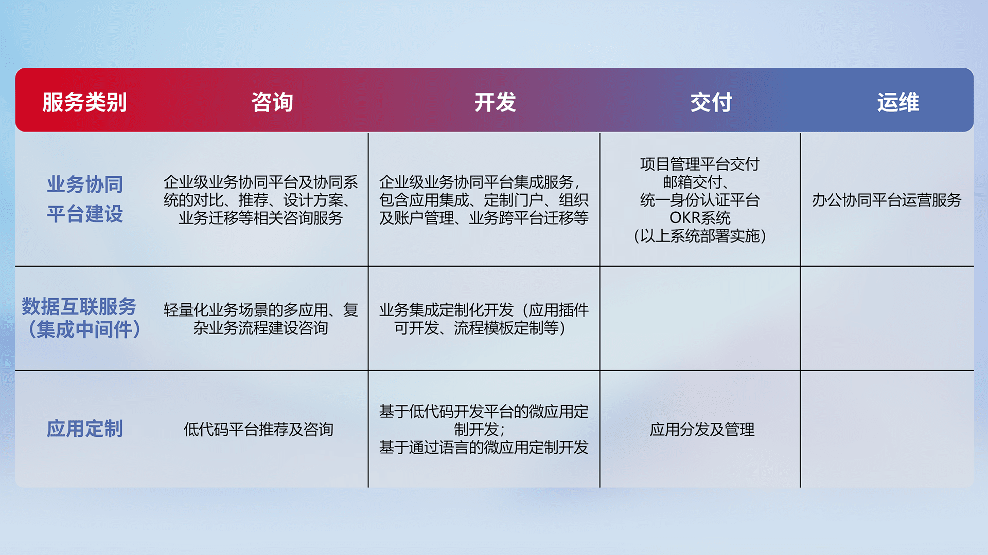 针对钉钉、、、企微、、IDaas等平台级产品提供产品的规划、、方案、、、、交付、、、、定制化开发等服务,,实现如统一协同办公、、、智能客户服务、、混合会议管理、、、、智能数据查询、、、等业务场景,,,,实现数字化转型。。。