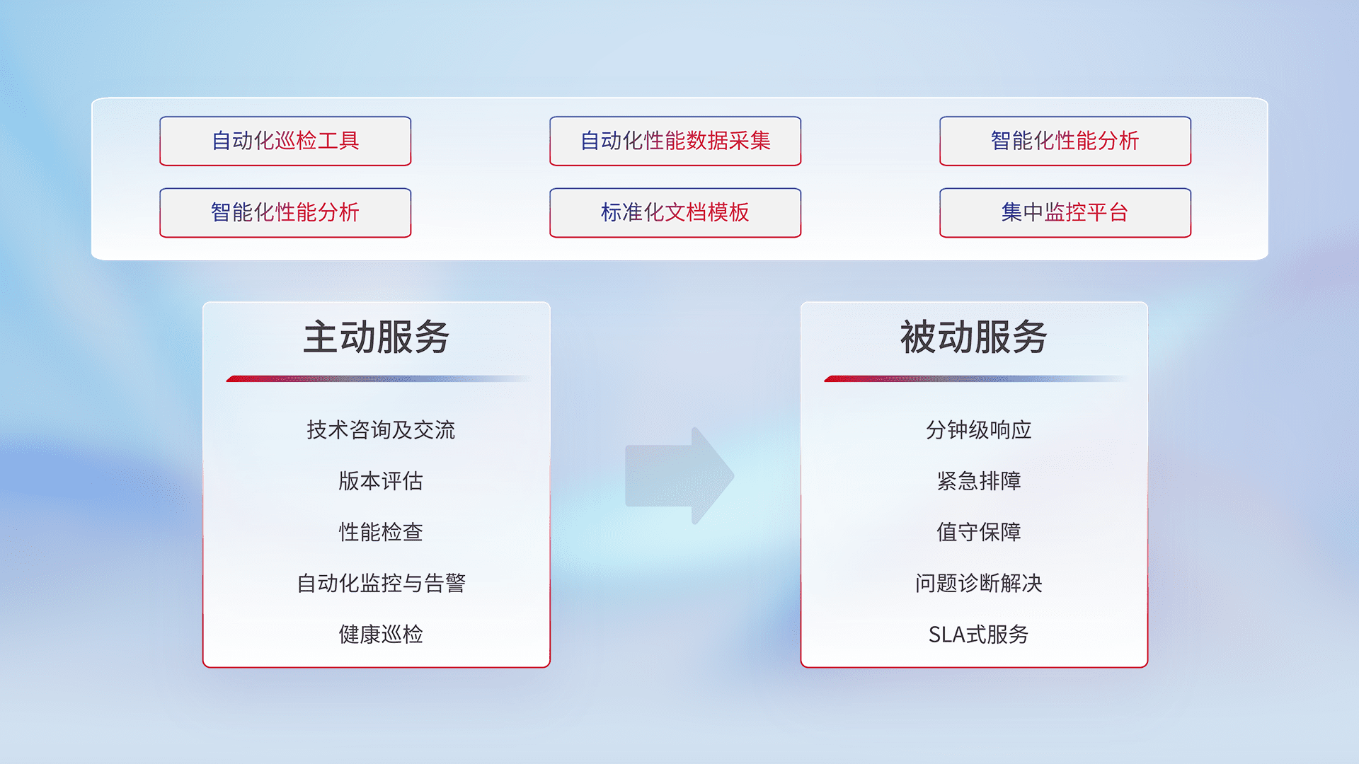 智能化工具和标准化文档,,,保障服务质量,,,,提供主动服务(包含技术咨询、、、、版本评估、、、性能检查、、自动化监控与告警、、健康巡检)和被动服务包含(分钟级响应、、、紧急排障、、值守保障、、、问题诊断解决、、、SLA服务)。。。。